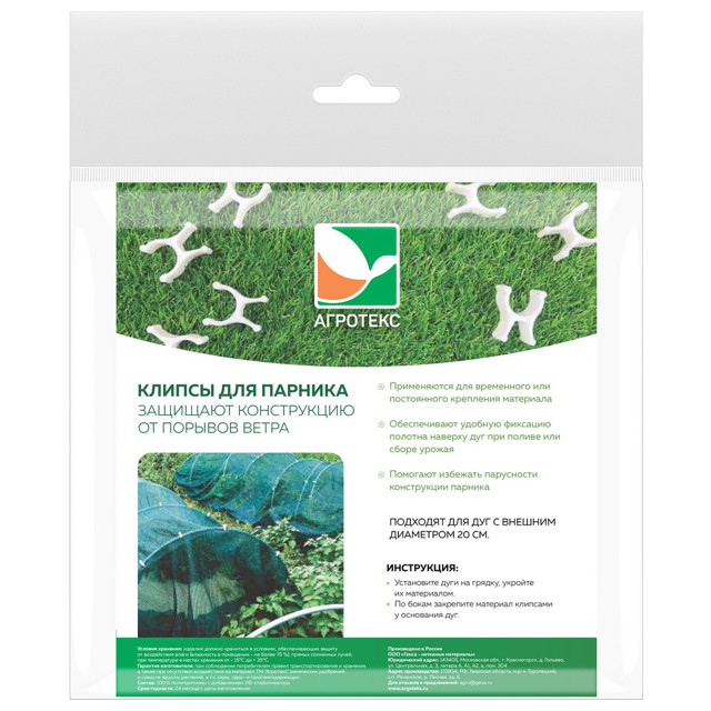 Защищают конструкцию от порывов ветра. Подходят для дуг с внешним диаметром 20 мм. Применяются для временного или постоянного крепления материала. Обеспечивают удобную фиксацию полотна наверху дуг при поливе или сборе урожая. Помогают избежать парусности конструкции парника. Инструкция: установите дуги на грядку, укройте их нетканым материалом. По бокам закрепите материал клипсами у основания дуг.