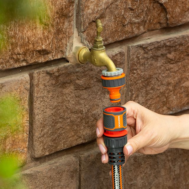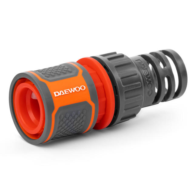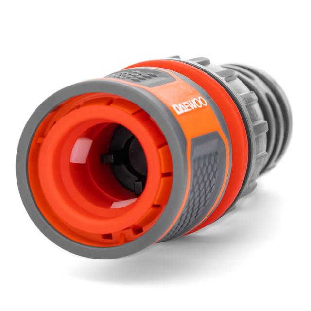Изготовлен из ударопрочного ABS пластика для долгого срока службы. Прорезиненные поверхности и эргономичная форма для удобной эксплуатации. Надежный 3х-лепестковый замок и жесткая металлическая пружина обеспечивают плотную фиксацию штуцера, что исключает протекание воды в соединении. Запорный клапан Aquastop автоматически перекрывает подачу воды при смене насадок. Совместим с базовой системой полива DAEWOO и других производителей. Удлинённый хвостовик препятствует заломам и повреждению шланга в месте крепления. Фиксаторы шланга выполнены из эластичного полипропилена и гарантируют крепкое соединение даже при высоком давлении.