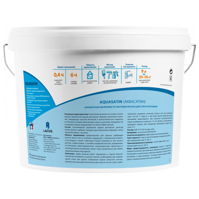 Водно-дисперсионная краска с антибактериальным комплексом на основе сополимерной акрилатной водной дисперсии. Применяется для окраски требующих частого мытья стен и потолков помещений с повышенной влажностью воздуха, а также с обычным (“сухим”) режимом, в том числе в детских, подростковых и лечебно-профилактических учреждениях. Образует шелковисто-матовое, обладающее высокой белизной и влагостойкостью покрытие, устойчивое к воздействию моющих средств, 5 % раствора хлорамина ?Б? и мокрому трению.