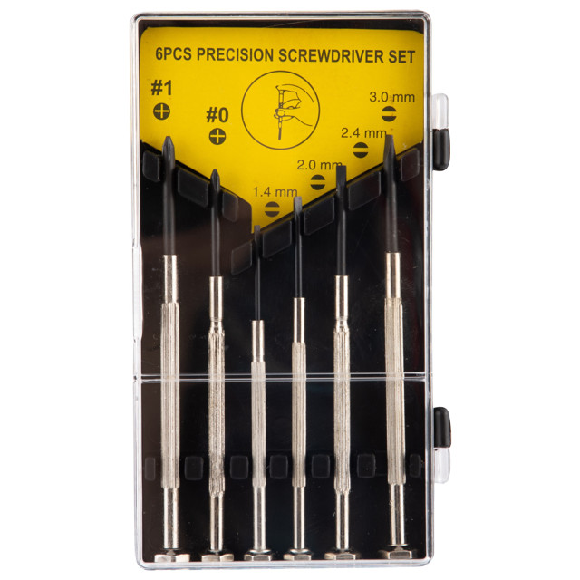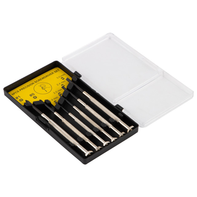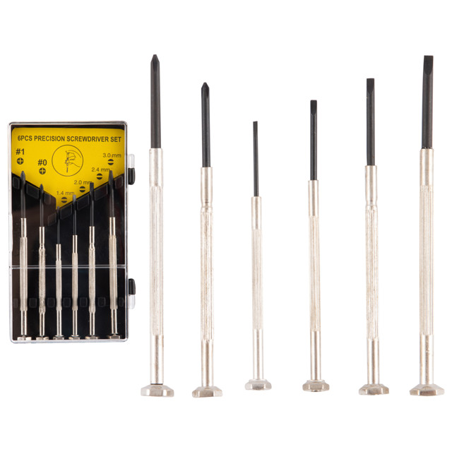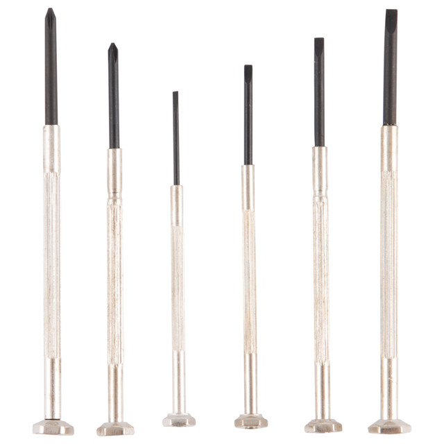 Набор часовых отверток состоит из 6 предметов. С помощью инструментов, входящих в комплект, можно выполнять ремонтные работы с мелкими деталями. Для удобства хранения и транспортировки набор поставляется в небольшом кейсе.