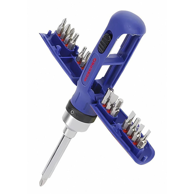 Реверсивная отвёртка с трещоткой 15 в 1 , 1/4”. Оснащена 3-позиционным, 72-зубчатый прецизионным храповиком: вперед/назад/блокировка 14 шт. бит, хранящихся в ручке. Вращающийся стержень из хромованадиевой стали для большей прочности и долговечности. Эргономичная ручка для улучшения захвата и контроля.