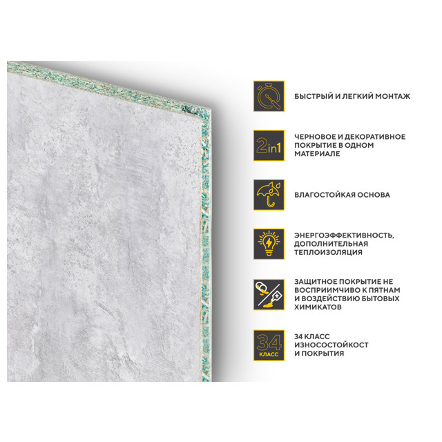 Влагостойкие шпунтованные строительные плиты с износостойким декоративным покрытием 34 класса истираемости. Для осуществления черновой и декоративной отделки одним материалом. Упаковка с плитами представляет собой 6 плит номинального размера 12 х 350 х 1180 мм в крафтовой коробке (2,478 м2). Удобство транспортировки за счет мобильного формата упаковки. Удобство монтажа за счет мини габаритов и небольшого веса плит.