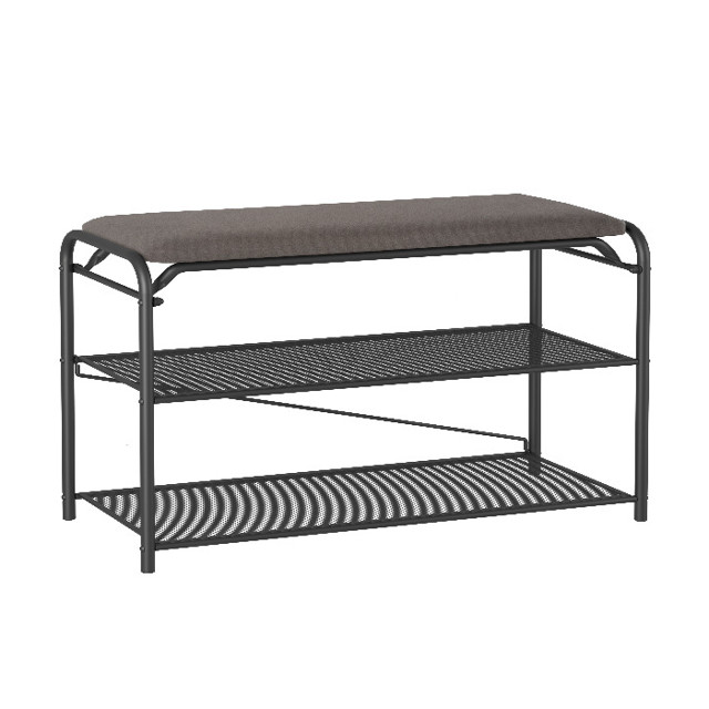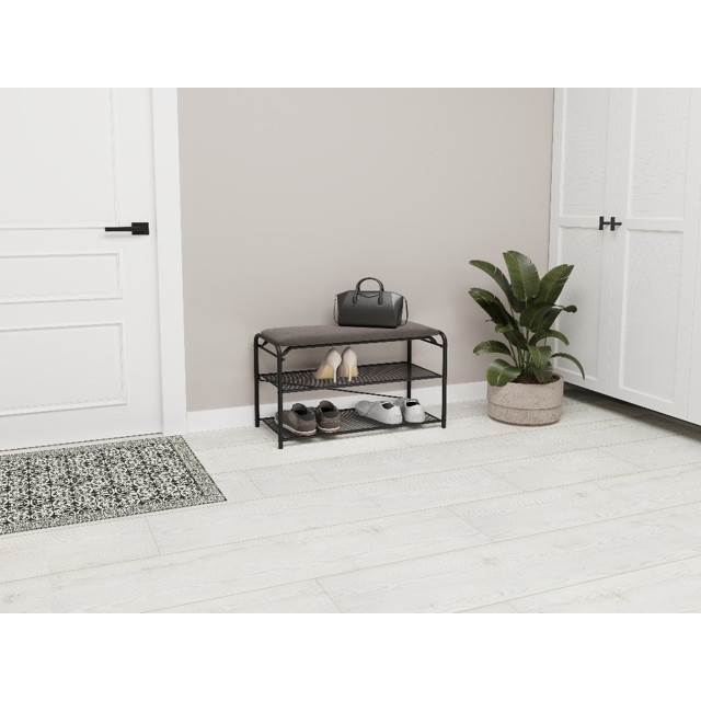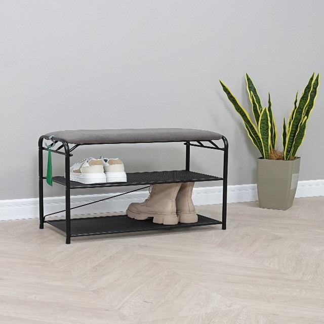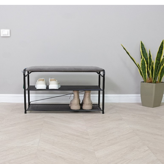 Долговечная, благодаря каркасу и полкам из стали. Две полки вместят до 6 пар обуви, а продуманные расстояния между ними позволят разместить как летнюю, так и зимнюю обувь. Каждая полка выдерживает нагрузку до 8 кг. Обувница оснащена ящиком для хранения обувного крема, комплектов запасных шнурков и других полезных вещей и мелочей. Сиденье банкетки обтянуто стильной тканью ”Нубук”, которая обладает высокой прочностью и износостойкостью. Ткань ”Нубук” устойчива к механическим повреждениям, не выцветает и не теряет своей формы даже после длительного использования. Сиденье выдерживает нагрузку до 120 кг. Современный, изысканный дизайн полки впишется в любой интерьер.