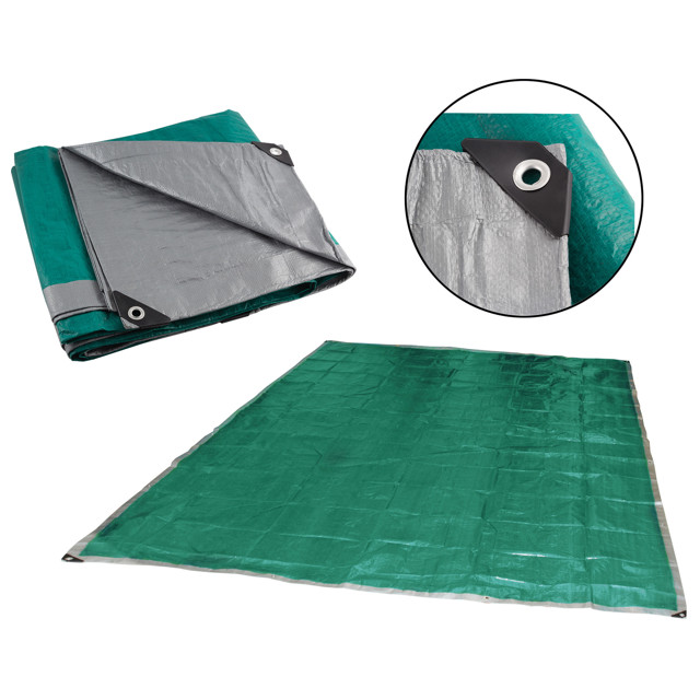 Тент из особо прочного полиэтилена. По краям полотна расположены алюминиевые люверсы через каждый метр. Края тента армированы. Предназначен для укрытия стройматериалов, сена, зерна и других продуктов сельского хозяйства от дождя и снега, сооружения временных навесов и строительства палаток.