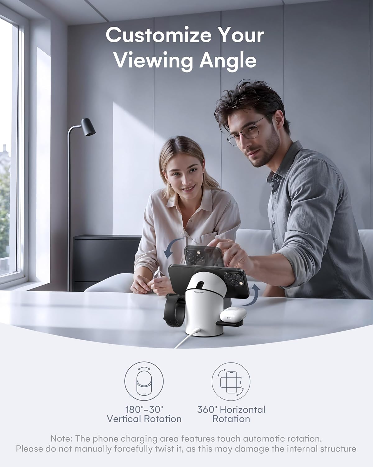 • AUTO-ROTATING PHONE CHARGER & POP-UP DOCK: The CylinTrick-R features a rotating phone charging area that doubles as a phone stand, allowing for easy viewing while charging. The charging docks for your AirPods and Apple Watch pop up with a press, saving space and keeping your setup organized when not in use.
